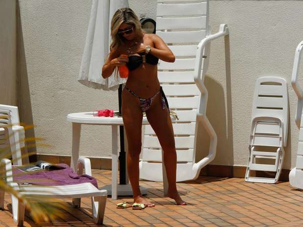 Eleita “musa da internet” após uma enquete promovida pela revista Vip, Aline Rodrigues foi fotografada em momentos particulares curtindo o sol à beira da piscina em São Paulo. Colocando o bronzeado em dia, a modelo tomou sol, se refrescou na piscina e usou seu celular para tirar fotos. Ao arrumar o biquíni, a beldade acabou mostrando demais para o fotógrafo de plantão.